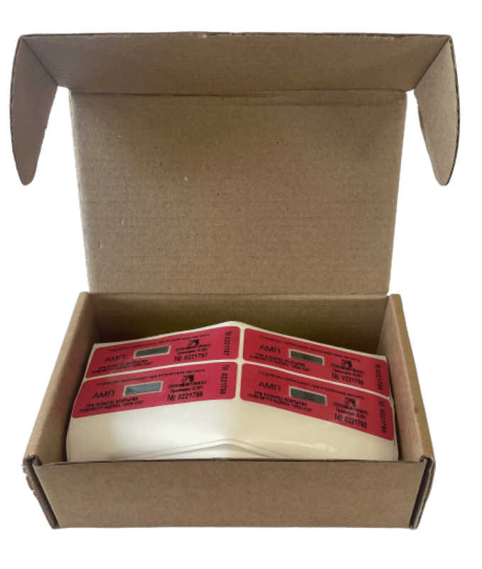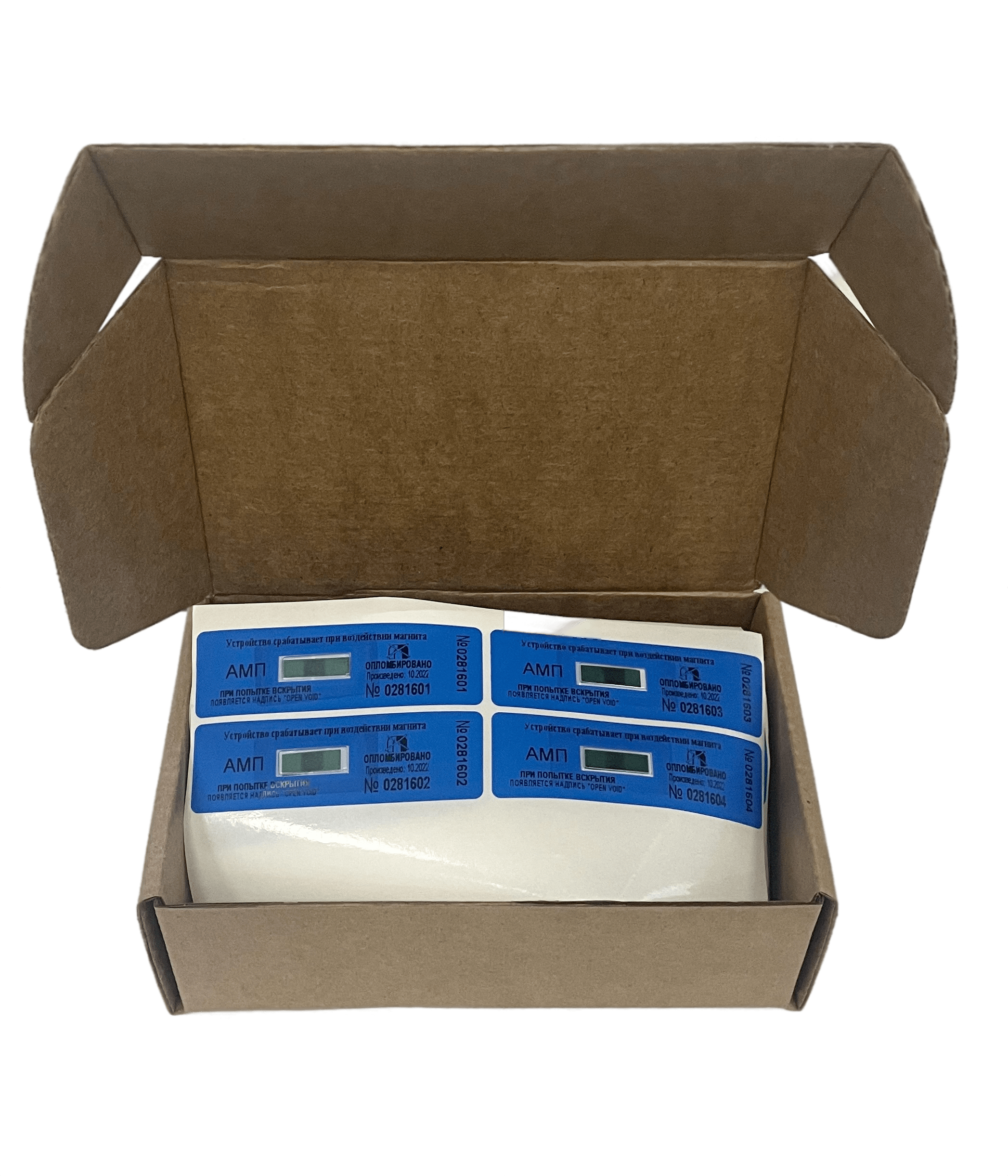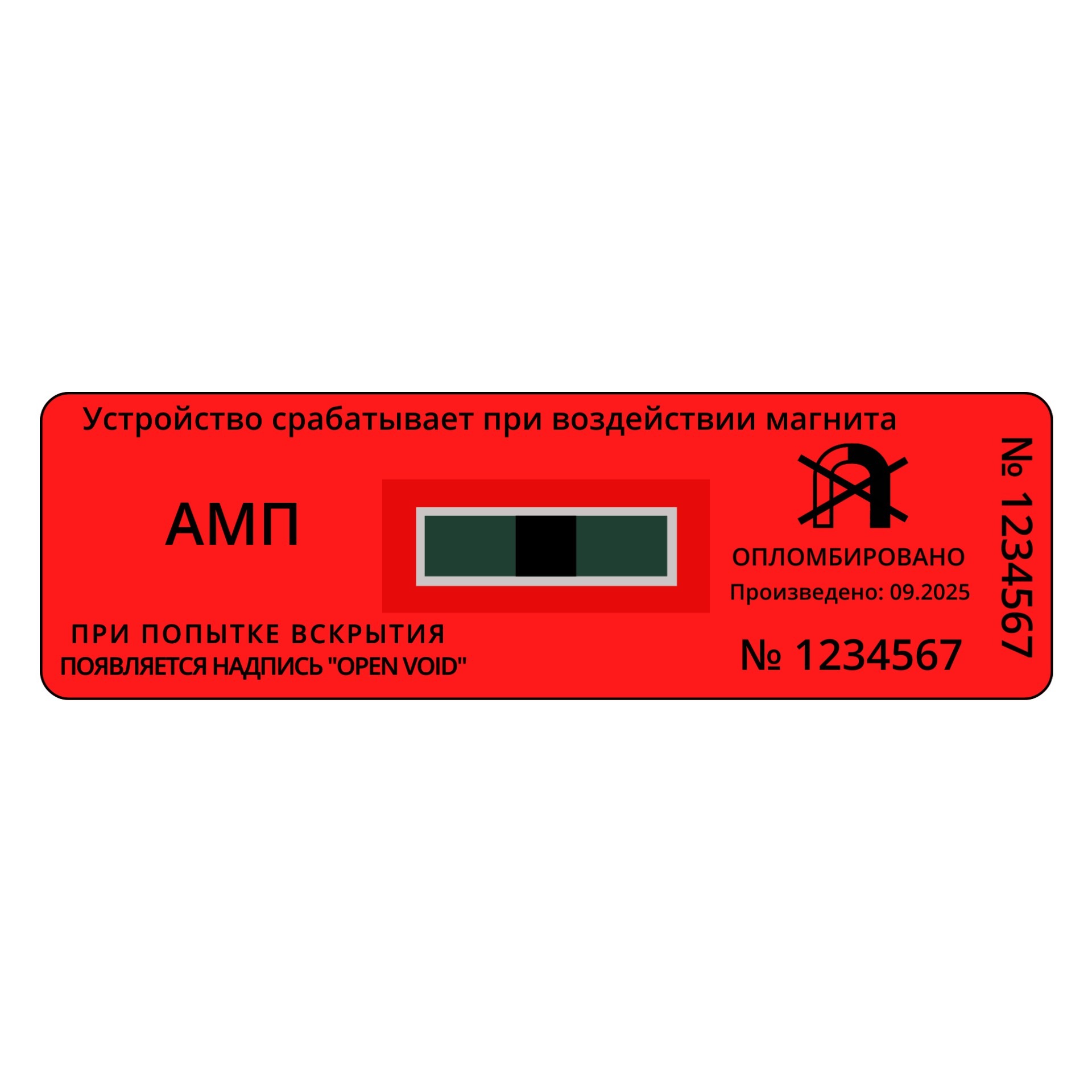 Антимагнитная пломба-наклейка 20х65мм АМП (30мТл) — это специальное защитное устройство, которое устанавливается на приборы учета коммунальных ресурсов (водомер, электросчетчик, газовый счетчик). Основная цель антимагнитной наклейки — предотвратить попытки несанкционированного изменения показаний приборов путем воздействия магнитного поля. Наклейка оснащена чувствительным элементом, реагирующим на воздействие магнита. При воздействии магнитным полем силой свыше 30 мТл, структура антимагнитной пластины разрушается на молекулярном уровне и фигуры исчезают, оставляя однородное темное поле.При попытке отклеивания на самой антимагнитной пломбе и на поверхности проявляются надписи: "OPEN VOID", не исчезающие при повторном наклеивании.
