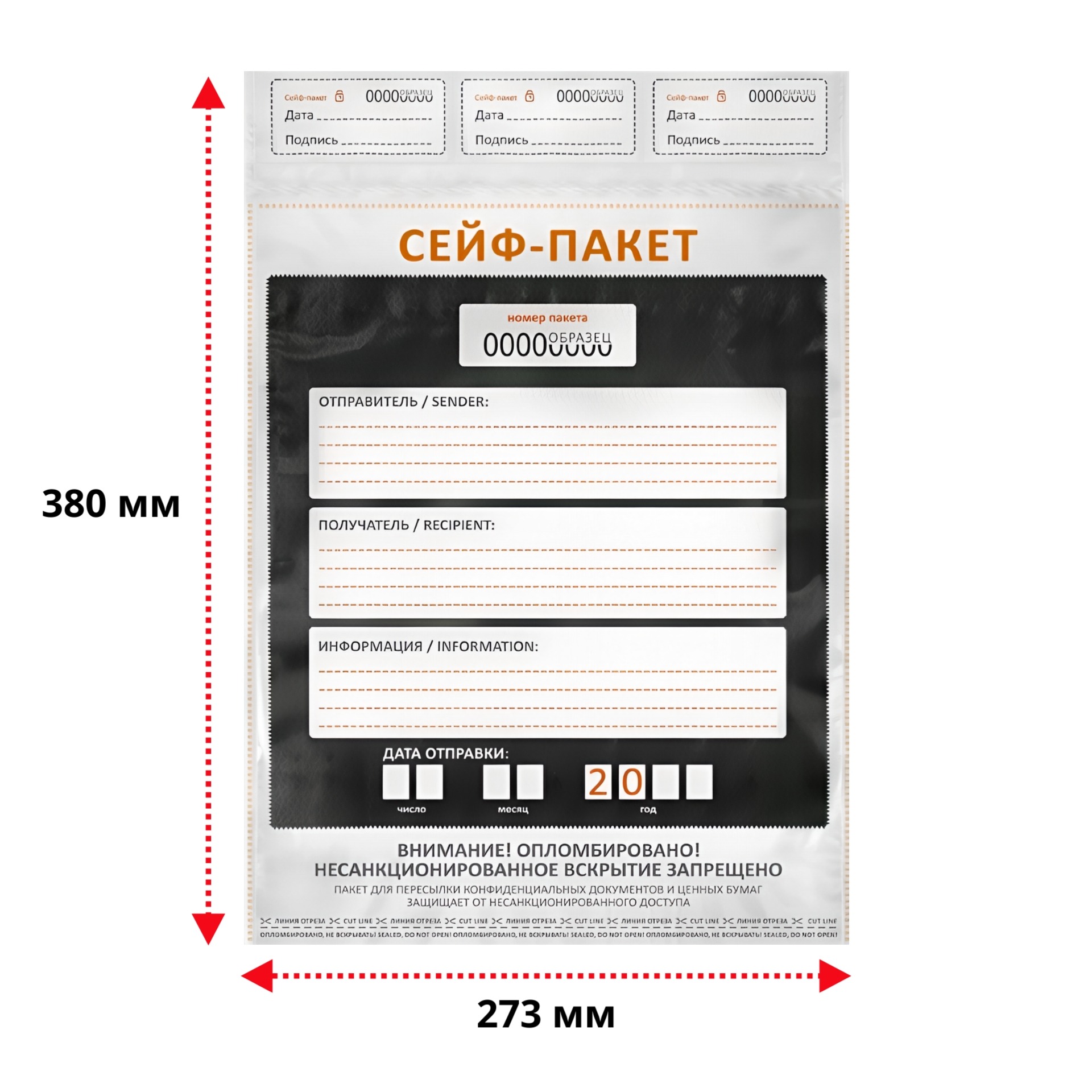 Сейф-пакет — это специализированная упаковка, предназначенная для безопасной транспортировки и хранения документов, денег, ювелирных изделий и других ценных вещей. Сейф-пакеты обеспечивают защиту содержимого от несанкционированного доступа, влаги, пыли и механических повреждений.Изготавливаются из многослойных полимерных пленок высокой прочности, обеспечивающих надежную защиту от проколов, разрывов и влаги. Закрываются путем склеивания клапанов специальными адгезивами, что делает пакет герметичным и безопасным. Каждый пакет оснащены индикаторами вскрытия, которые показывают попытку проникновения внутрь пакета. Сейф-пакеты снабжены полями для заполнения информации о владельце, отправителе и получателе, что облегчает учет и отслеживание перемещения пакетов.