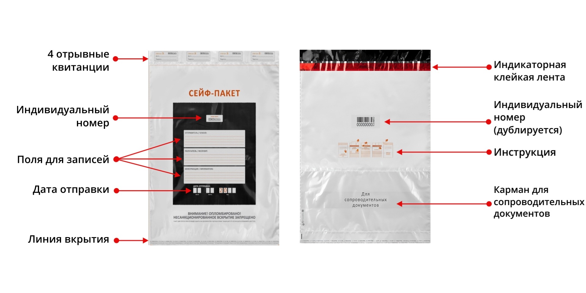 Сейф-пакет — это специализированная упаковка, предназначенная для безопасной транспортировки и хранения документов, денег, ювелирных изделий и других ценных вещей. Сейф-пакеты обеспечивают защиту содержимого от несанкционированного доступа, влаги, пыли и механических повреждений.Изготавливаются из многослойных полимерных пленок высокой прочности, обеспечивающих надежную защиту от проколов, разрывов и влаги. Закрываются путем склеивания клапанов специальными адгезивами, что делает пакет герметичным и безопасным. Каждый пакет оснащены индикаторами вскрытия, которые показывают попытку проникновения внутрь пакета. Сейф-пакеты снабжены полями для заполнения информации о владельце, отправителе и получателе, что облегчает учет и отслеживание перемещения пакетов.